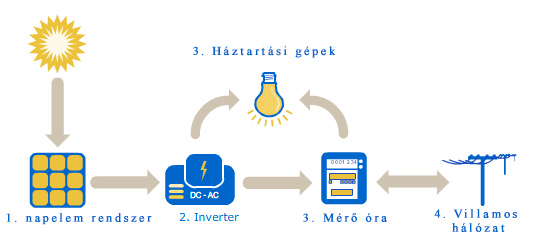 A hálózatra kapcsolt napelemes rendszerek a megtermelt áramot visszatáplálja a kiépített villamos hálózatba, vagyis a szolgáltatónak termel. Számlázásnál a megtermelt energia és az elfogyasztott energia közötti különbséget kell kifizetni.Főbb részei: napelemek, Inverter, fogyasztásmérő (oda-vissza mérő)